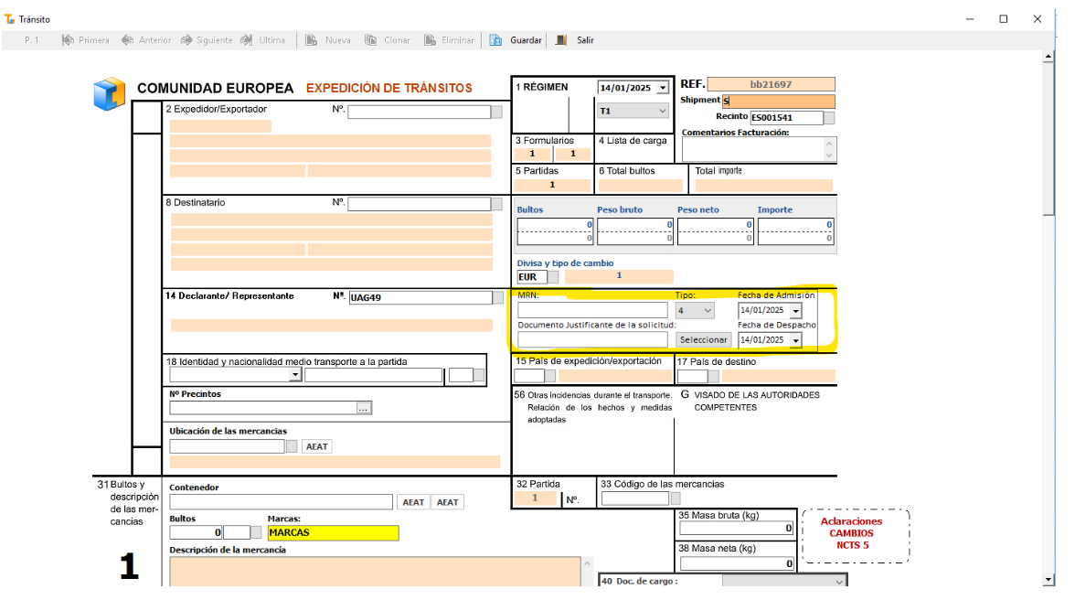 Se visualizará la siguiente ventana y se deberán cumplimentar los datos señalados que son exclusivos del mensaje TNN. Además deberán cumplimentar el resto de información del tránsito, datos de cabecera y las partidas correspondientes.