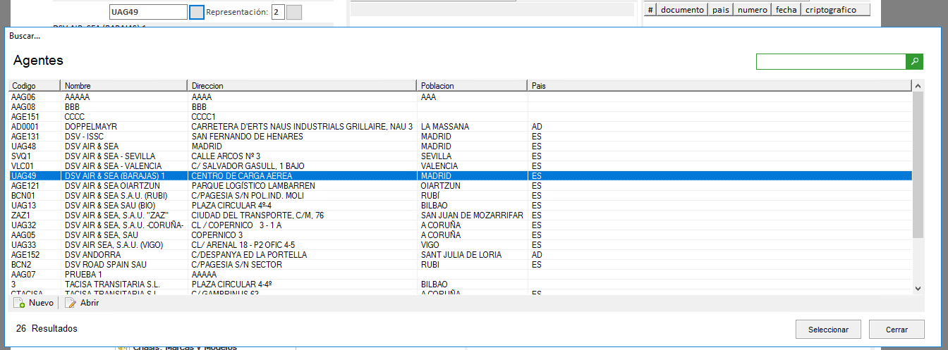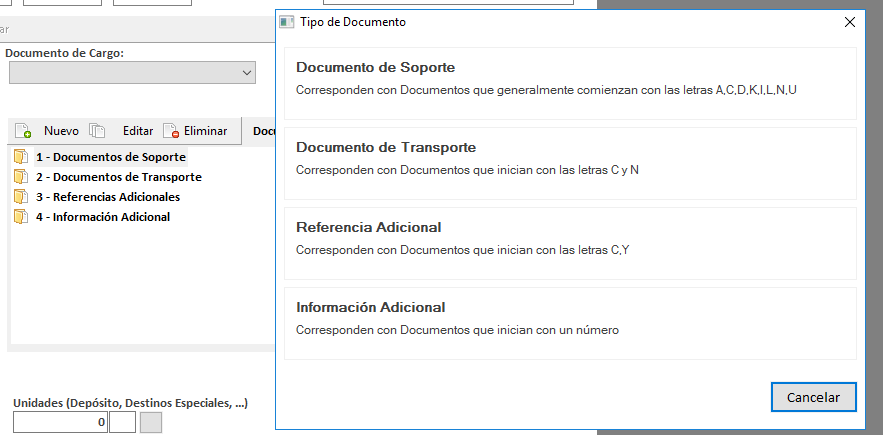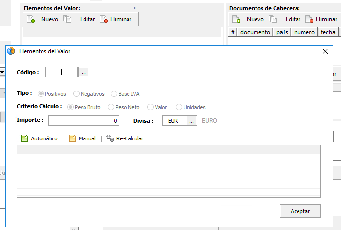 - Al confirmar la selección, se abre la ventana Edición de Documentos para completar los datos específicos (código, país, número, fecha, etc.).
