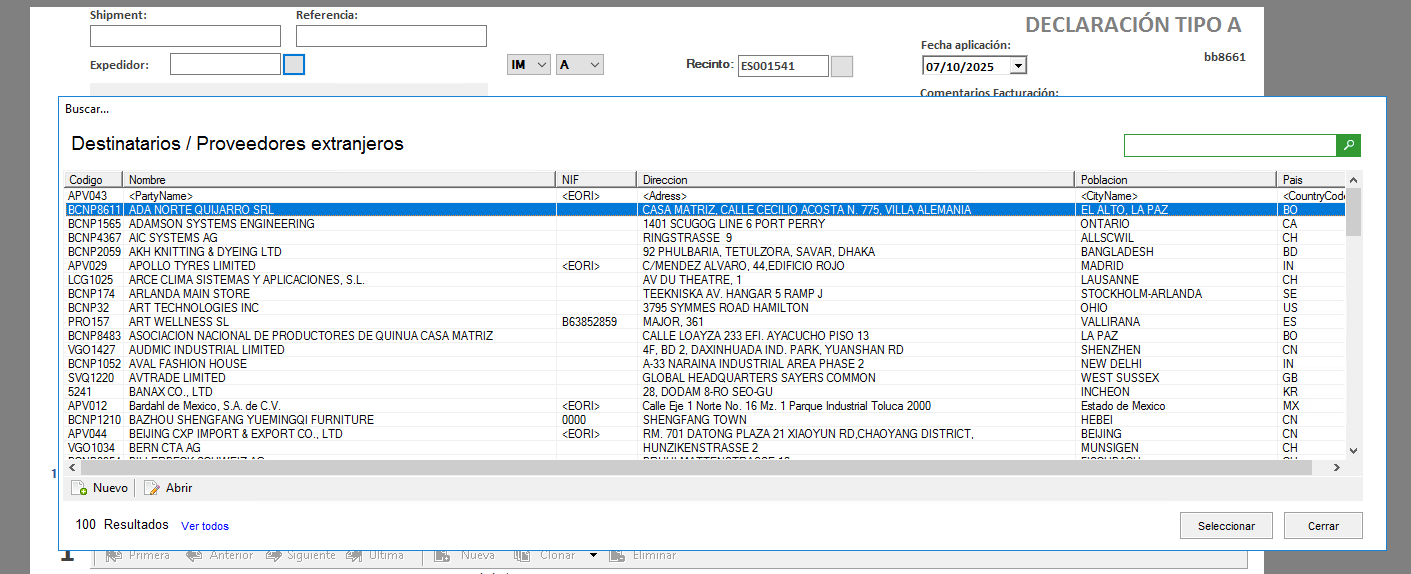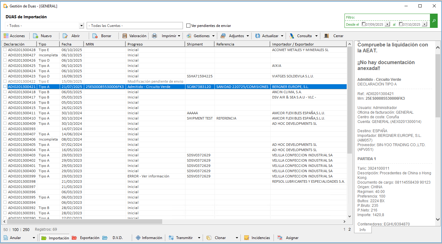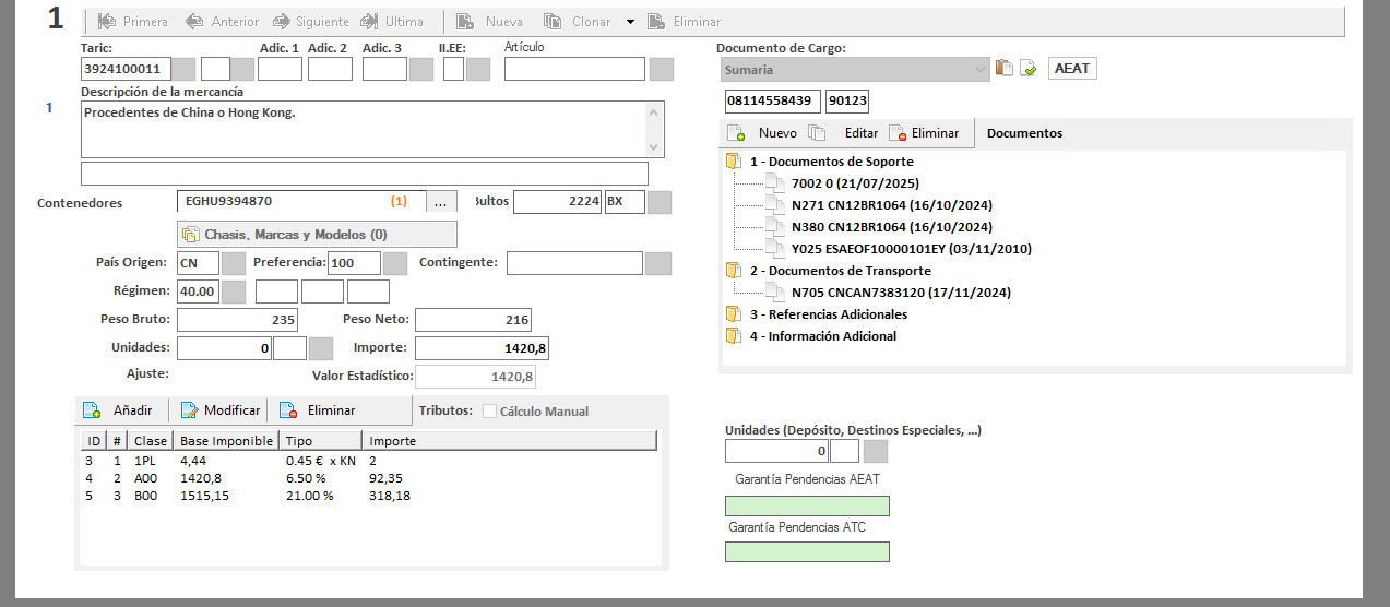- Adjuntos: Permite anexar o visualizar documentación digital (facturas, packing list, certificados...).