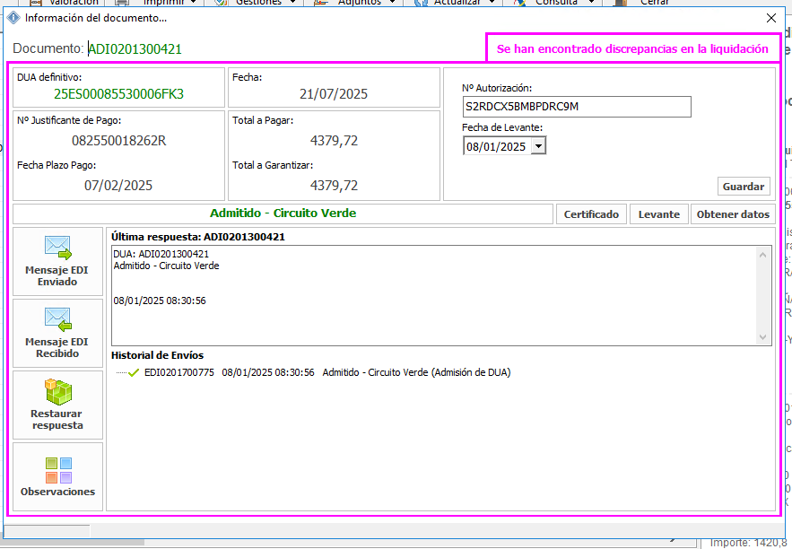 Desde esta vista, el operador puede consultar el número definitivo de DUA, la respuesta EDI recibida, el historial de envíos y las discrepancias detectadas en la liquidación.