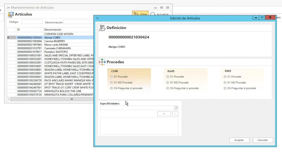 CONFIGURACIÓN DE LOS PROCEDES A NIVEL DE ARTÍCULO (Se puede activar para el cliente):