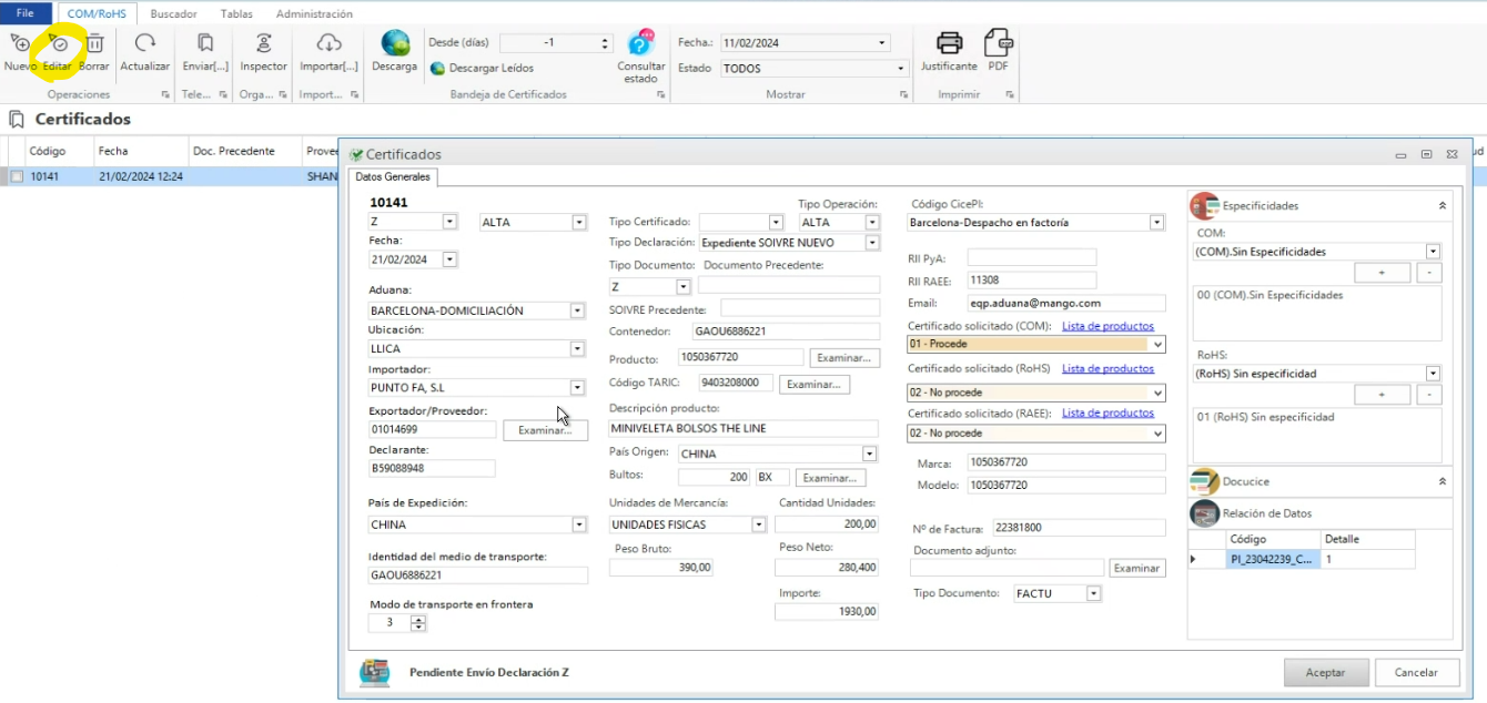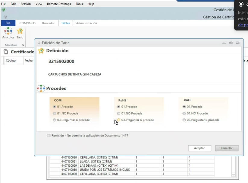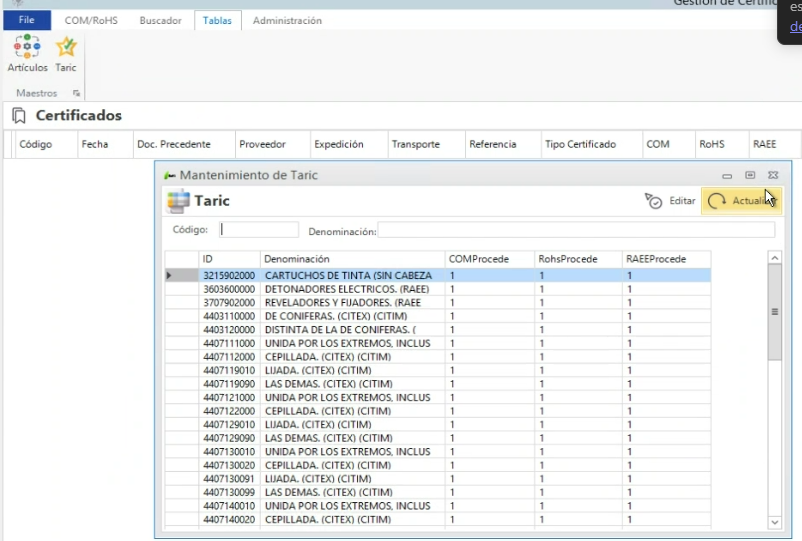 Se saca la información de Taric.es, para saber si ese Taric exige COM, ROHS o RAE.