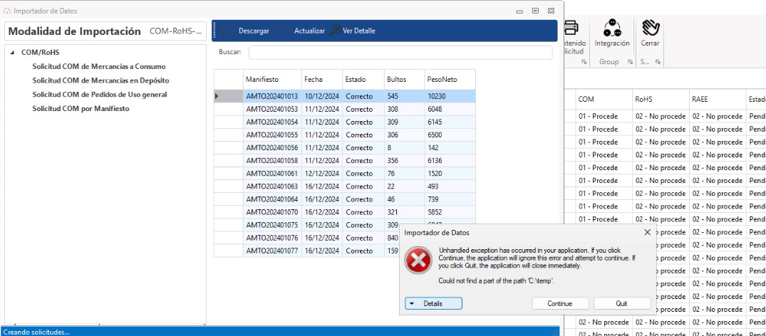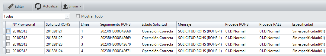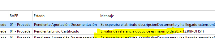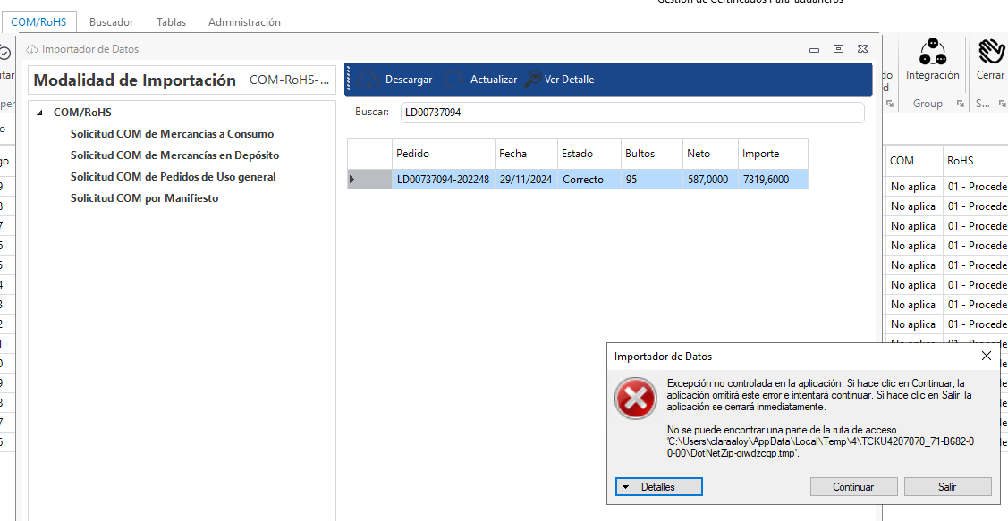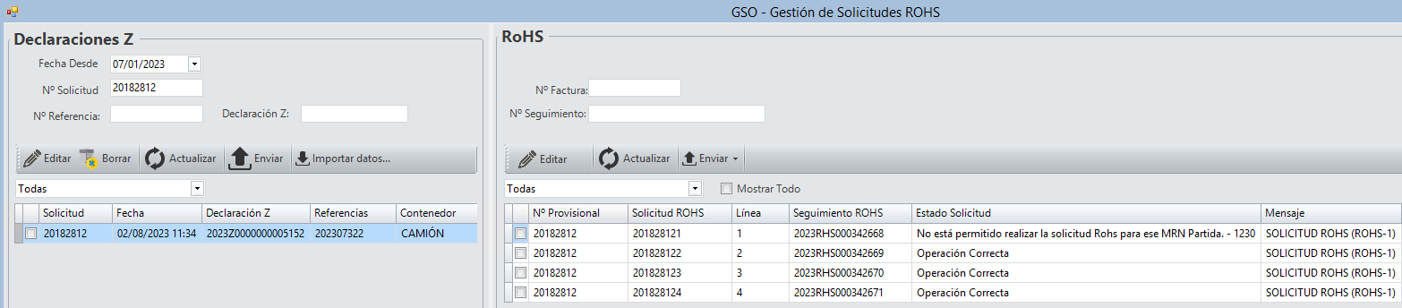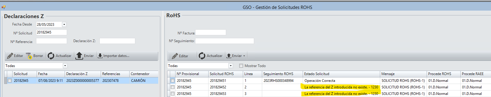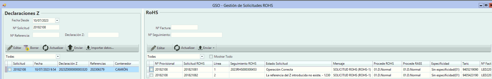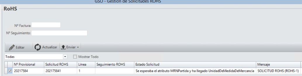 Error "No está permitido realizar la solicitud Rohs para ese MRN Partida - 1230"