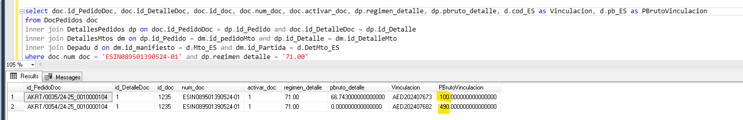 select doc.id_PedidoDoc, doc.id_DetalleDoc, doc.id_doc, doc.num_doc, doc.activar_doc, dp.regimen_detalle, dp.pbruto_detalle, d.cod_ES as Vinculacion, d.pb_ES as PBrutoVinculacion