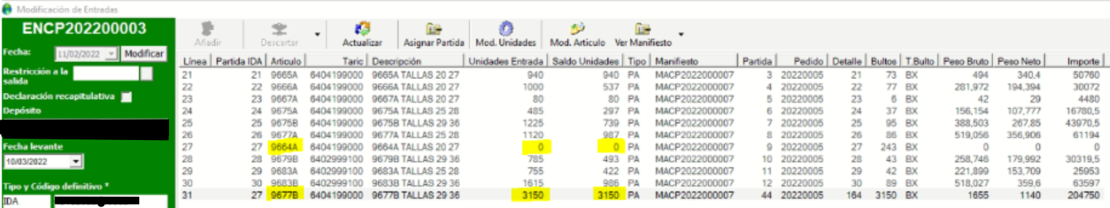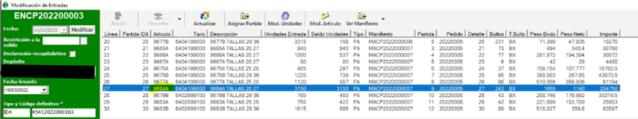 Nos saldrá un listado de las entradas que tienen ese artículo 9664A y las unidades que quedan disponibles.