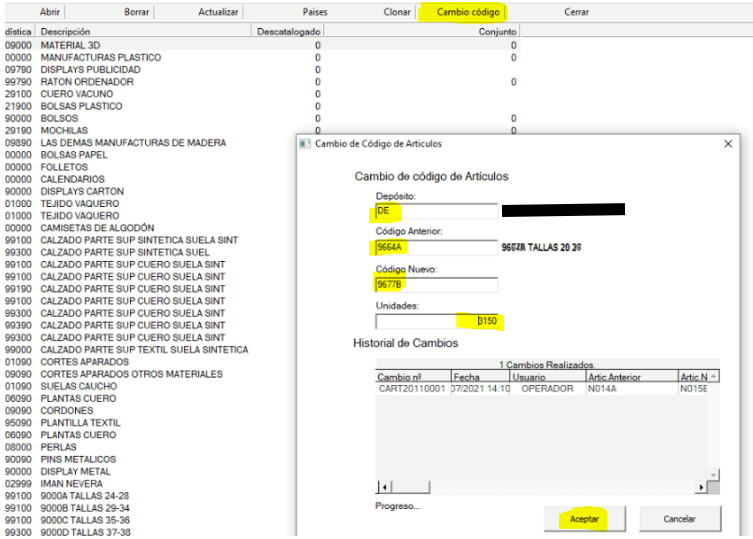 Al darle a aceptar, en la entrada pondrá la línea del artículo viejo a 0 UN y añadirá otra línea al final de la entrada, con el código del artículo nuevo y las 3150 UN.