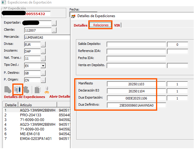 Ir a la expedición, Editar -> Relaciones y copiar estos datos de Manifiesto, B3, DUA. Para saber qué es lo que tenemos que anular.