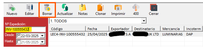 6) Eliminar Factura: Ir a Expediciones y Borrar: