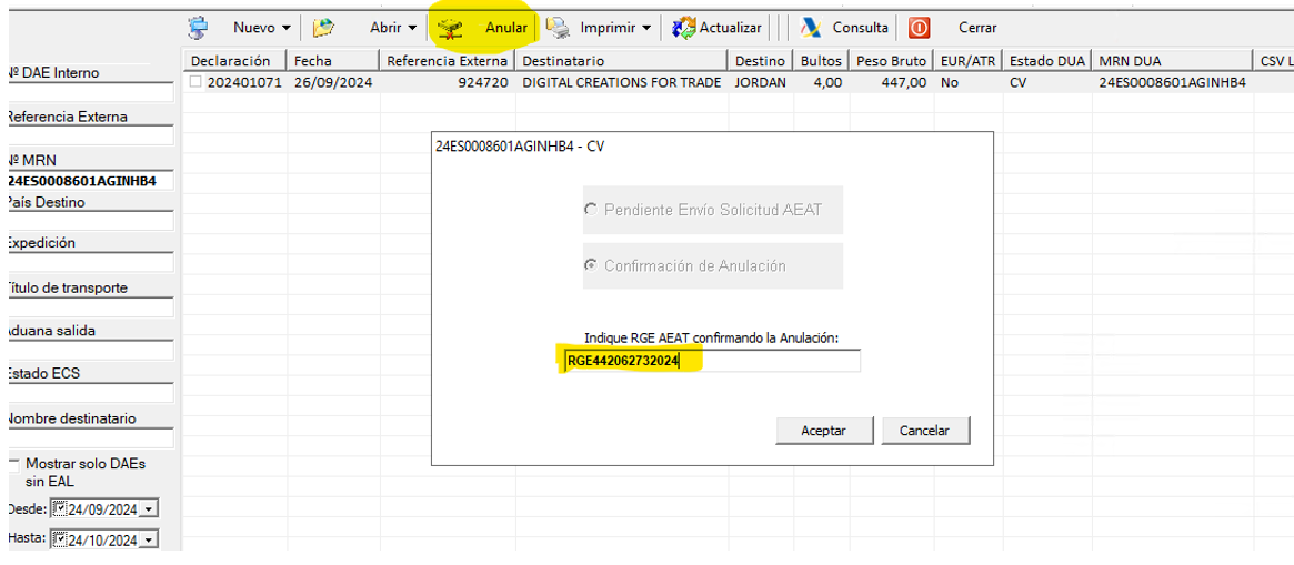 Vamos a la ventana de DAE y le damos a Anular e indicamos el código de RGE y le damos a Aceptar: