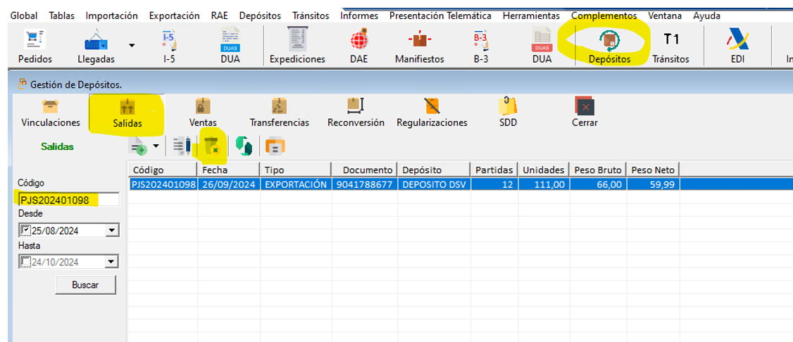 Y vamos a Depositos à Salidas à pegamos el número de la salida y le damos a Borrar: