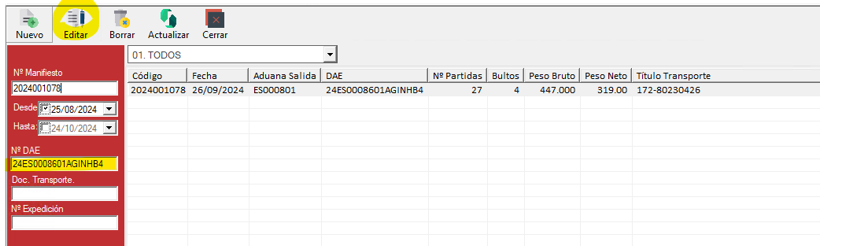 2) Pegamos el MRN del DAE en la pestaña Manifiesto. Le damos a Editar