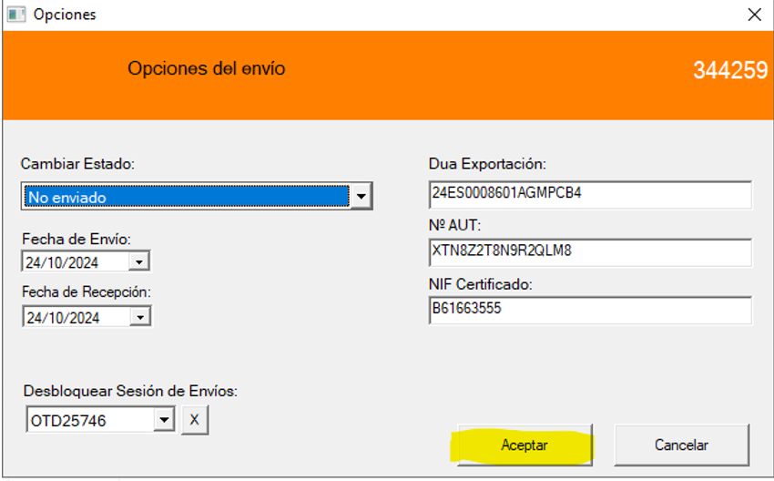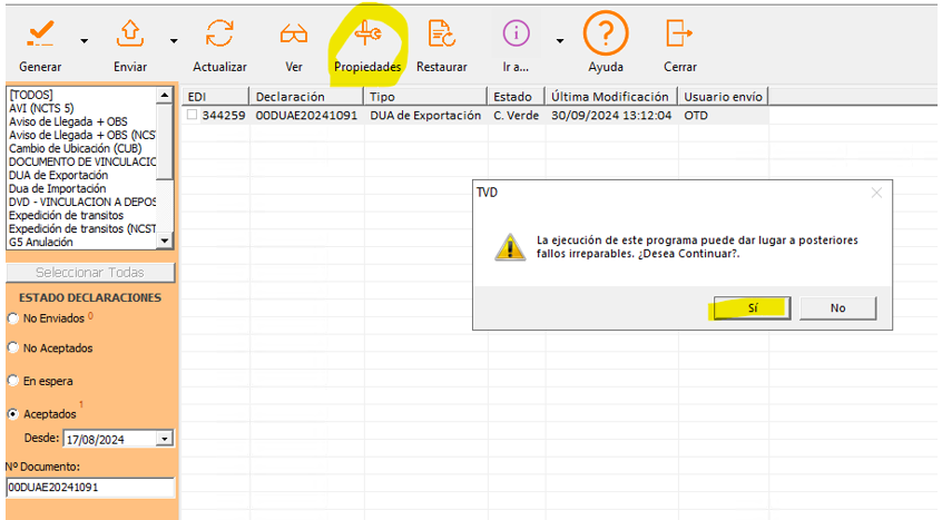 Le damos a Propiedades à Sí y Aceptar. Para que nos quede el DUA como no enviado, y nos lo deje eliminar desde DUA.