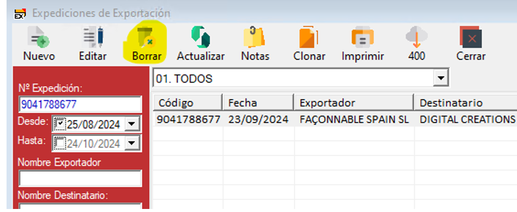 Vamos a la ventana de Expediciones y le damos a Borrar la Factura.