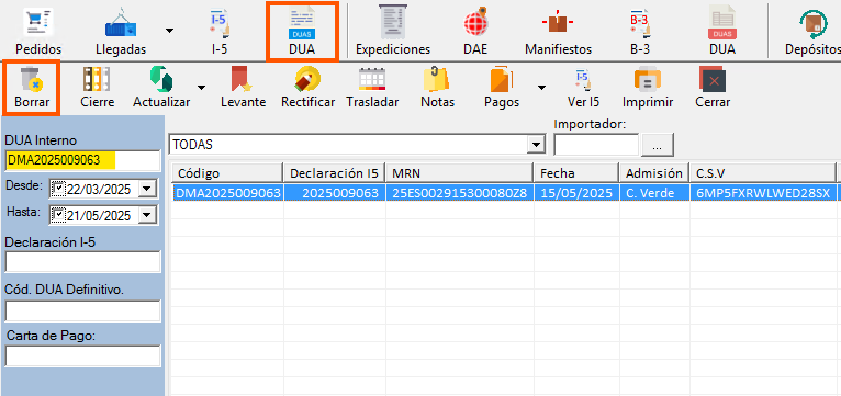 2) Eliminar DUA: Ir a DUA y Borrar: