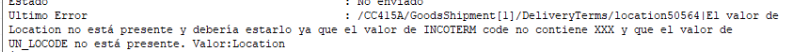 Error al enviar dua de importación /CC415A/GoodsShipment/DeliveryTerms Valor:Location
