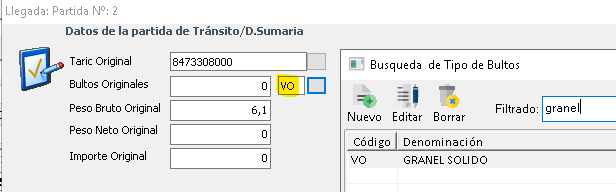 Por lo que hay que indicar en el tipo de bultos, VO (Granel sólido)