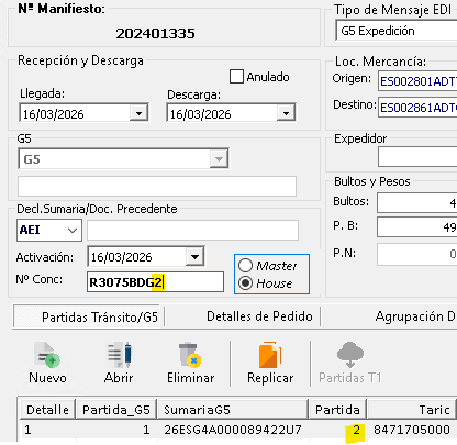 En la casilla Nº Conc: indicar el ID TRANSPORTE seguido de la partida global del G4