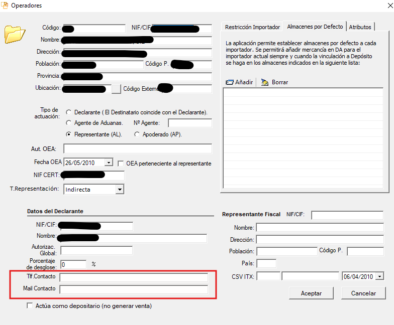 El exportador de la factura no tiene cubiertas las casillas del Teléfono y del Mail