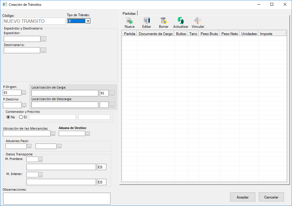 Esta pantalla se utiliza para dar de alta y configurar un nuevo documento de tránsito (T1/T2LF/TIR) antes de vincular las mercancías y enviarlo a la AEAT.