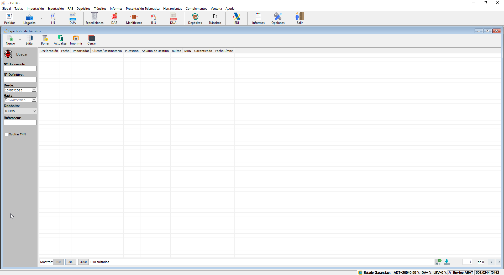 Esta pantalla centraliza la gestión de expediciones de tránsitos (documentos T1/T2LF/TIR), permitiendo crear, editar, buscar e imprimir los envíos a través de aduanas para mercancías en régimen de tránsito.