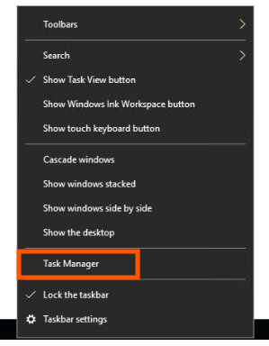 Botón derecho en la barra de herramientas y pinchar en Task Manager (Administrador de Tareas)
