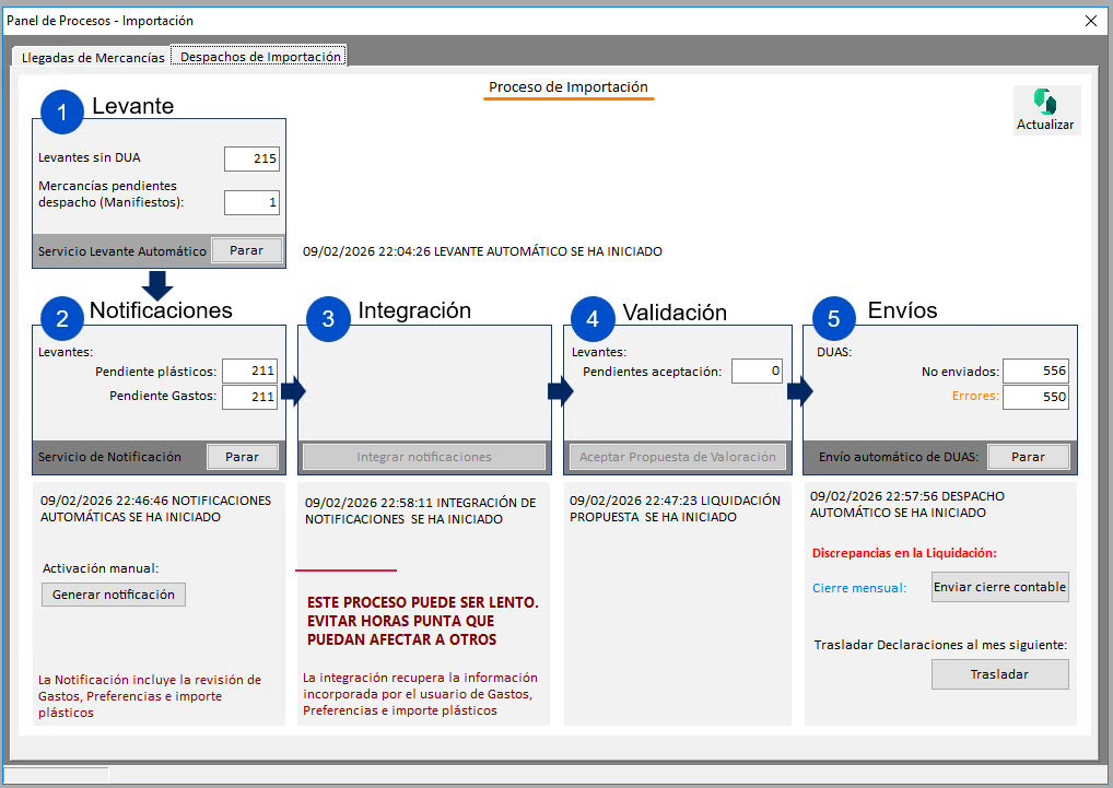 Este panel centraliza el seguimiento y ejecución de las tareas necesarias para completar una importación, desde los levantes (I5) hasta el envío automático de los DUAs. Presenta el flujo en pasos consecutivos, con contadores de pendientes y botones de acción para arrancar/parar servicios y ejecutar tareas manuales cuando sea necesario.