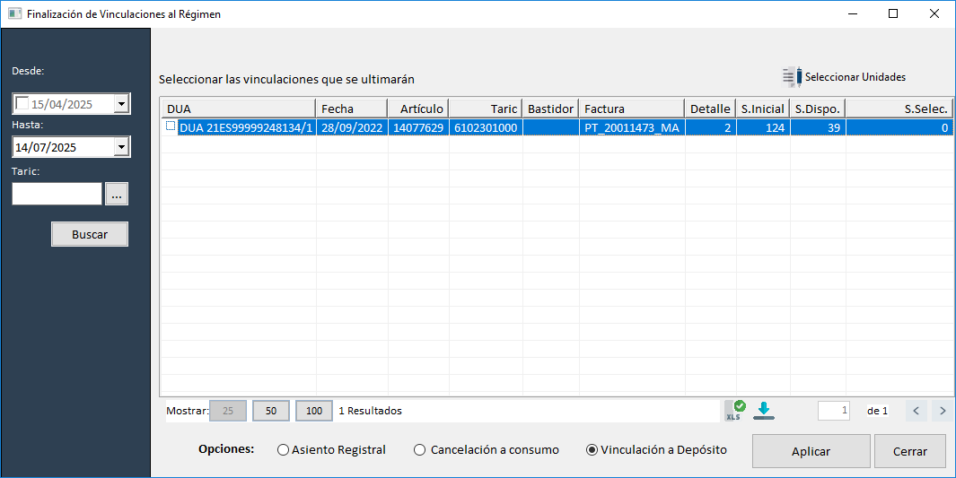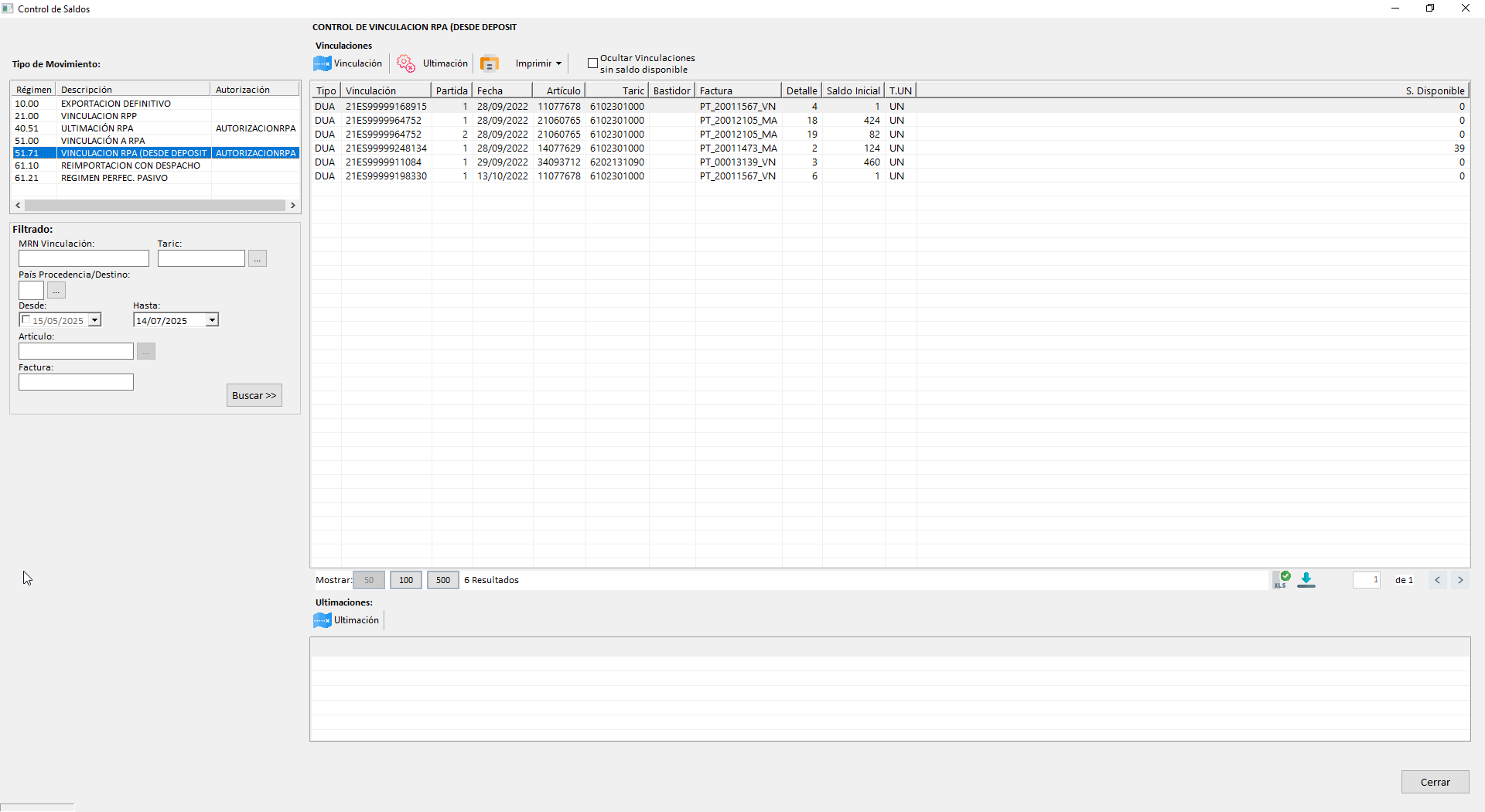 Esta pantalla centraliza la gestión de saldos y operaciones de vinculación/ultimación bajo regímenes suspensivos (RPA, RPP, etc.)