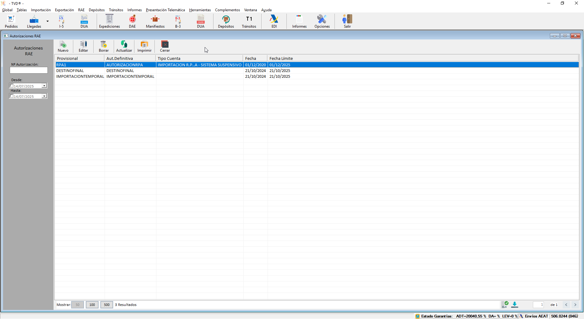 Esta ventana permite gestionar las autorizaciones RAE (Regímenes de Aplazamiento Especial) asociadas a la empresa, como los permisos RPA, destinos finales o importaciones temporales. Desde aquí puede crear nuevos registros, editar o borrar los existentes, e imprimir listados.