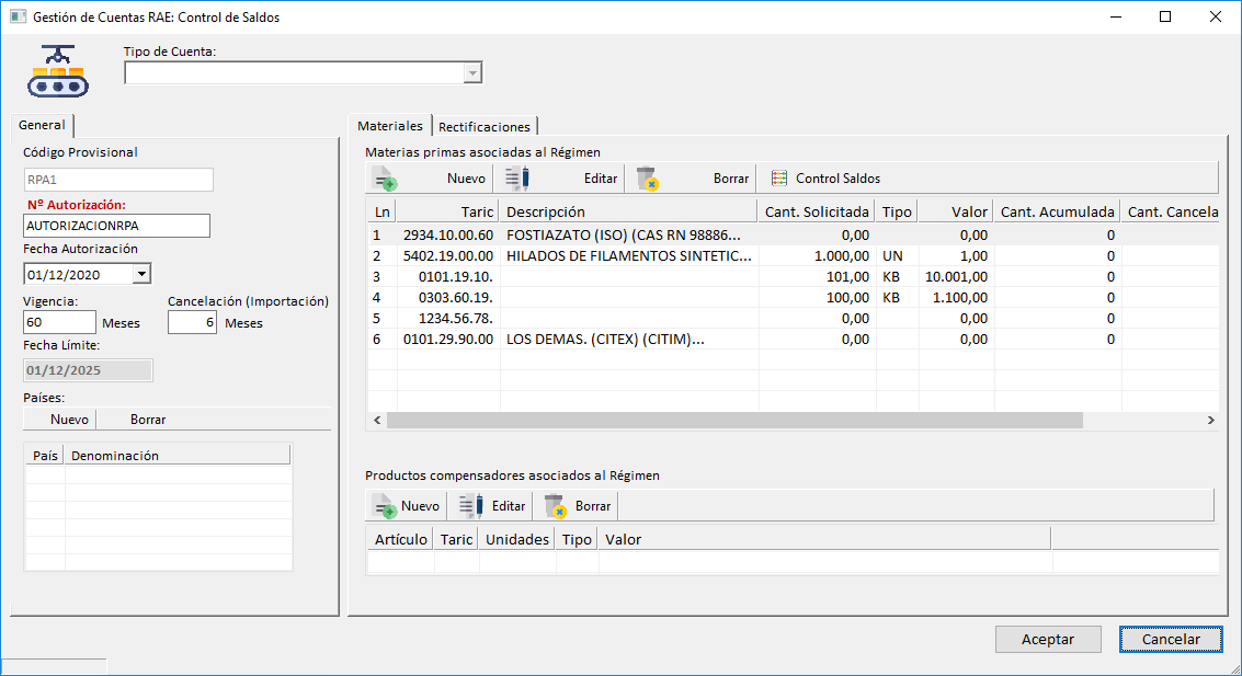 Esta ventana permite configurar y controlar las cuentas RAE (Regímenes de Aplazamiento Especial) y gestionar sus saldos de materias primas y productos compensadores asociados. Se compone de tres secciones principales: panel general de la autorización, pestañas de detalle (Materiales, Rectificaciones) y botones de acción.