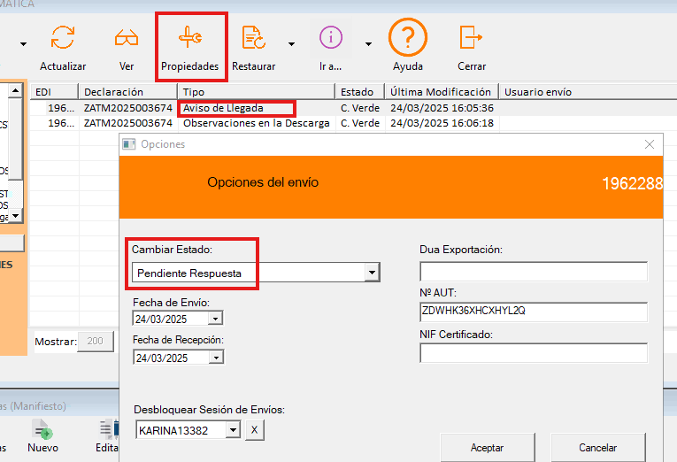 En el TVD buscamos el AVI en el EDI y le damos a Propiedades --> Pendiente de respuesta
