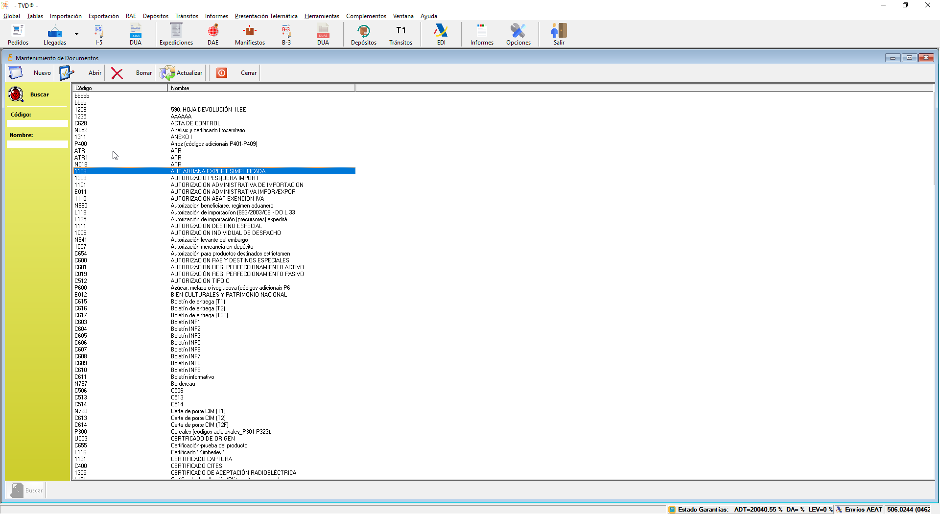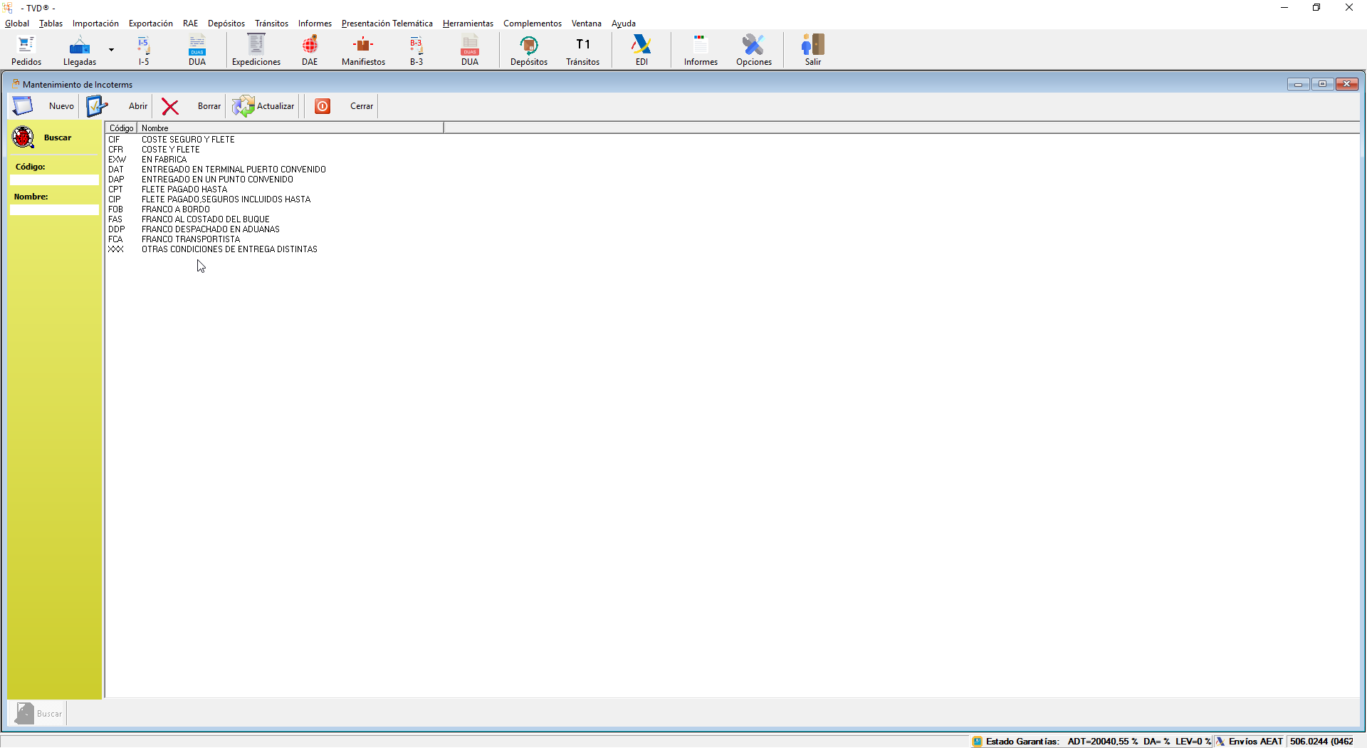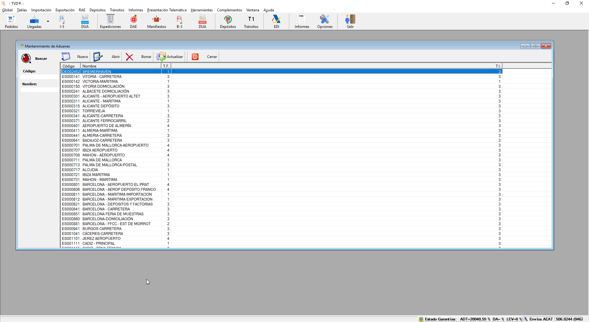 La pantalla Mantenimiento de Aduanas permite gestionar el catálogo de recintos aduaneros (puertos, aeropuertos, carreteras, depósitos, etc.) que utiliza TVD en todas sus operaciones de importación, exportación y tránsito.