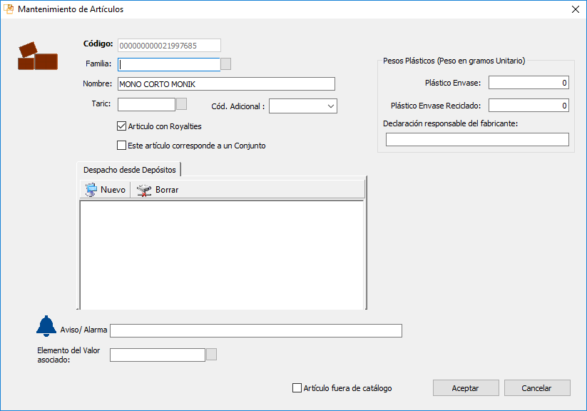| Descatalogado | Checkbox | Marca ✓ si el artículo está dado de baja (no se usa en nuevas operaciones). |