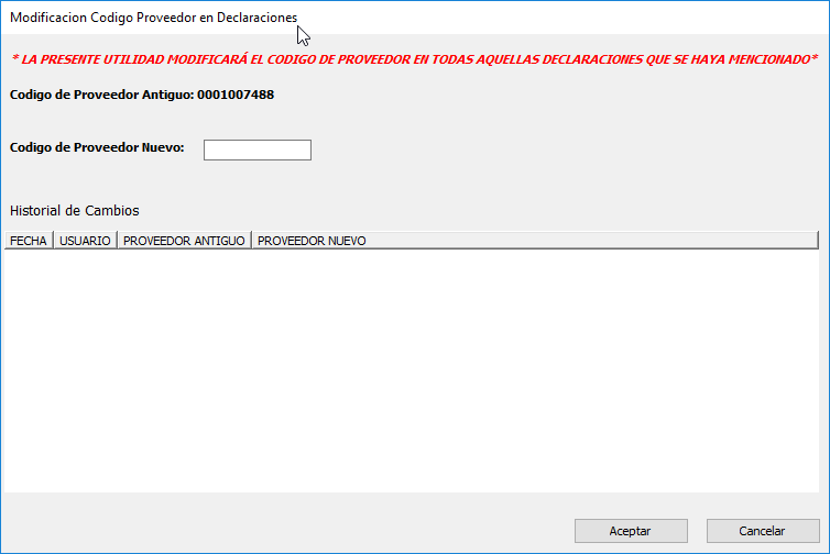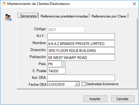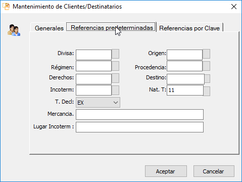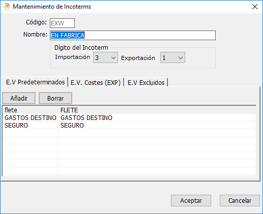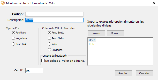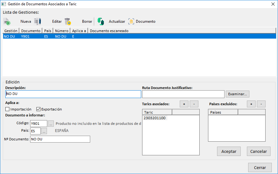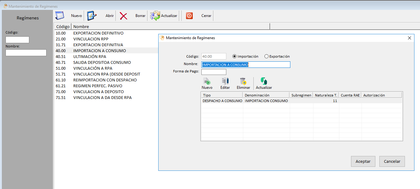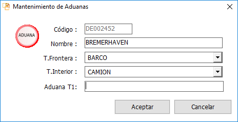 | Aceptar | Valida los datos y guarda la aduana en la base de datos. Cierra la ventana y refresca la lista. |