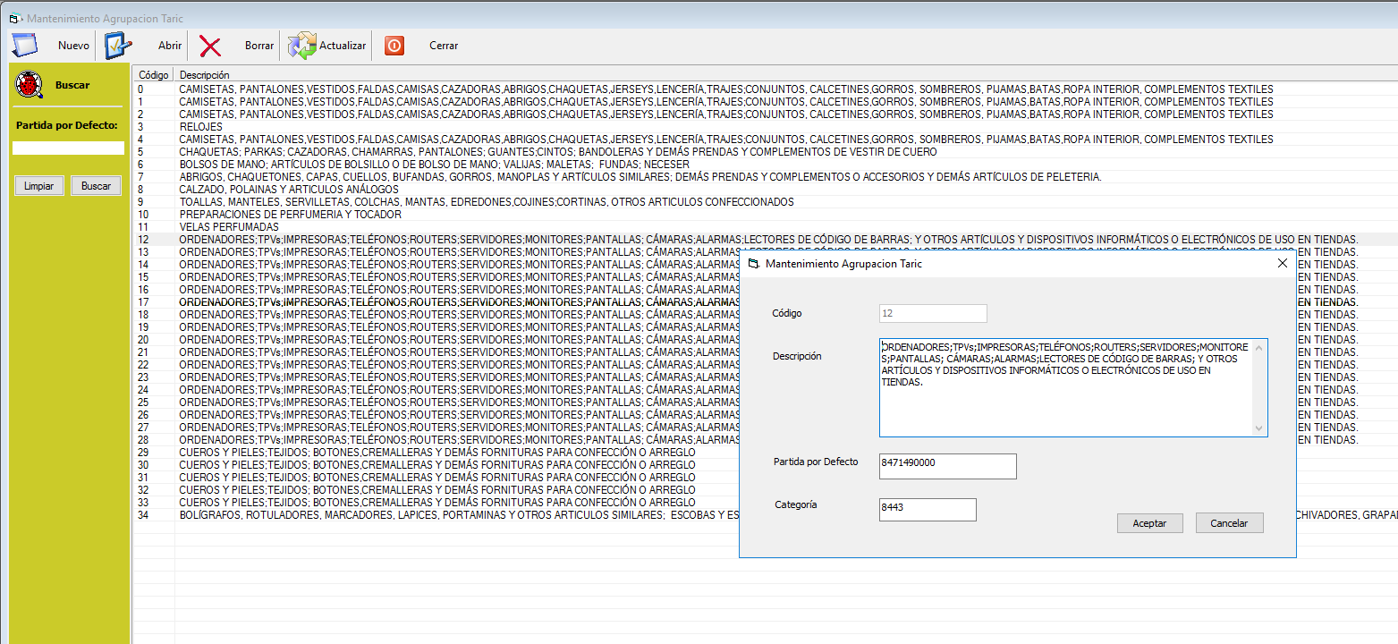 Código arancelario (8 dígitos). Permite buscar por partida estadística asignada. -