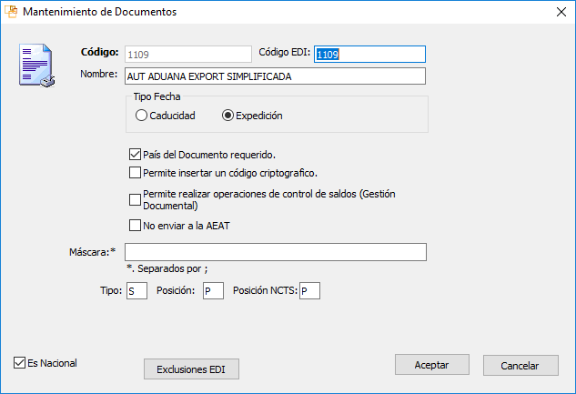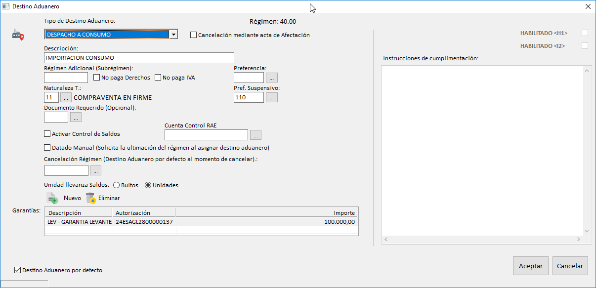 | Tipo (radio) | • Depósito Aduanero (predeterminado) |