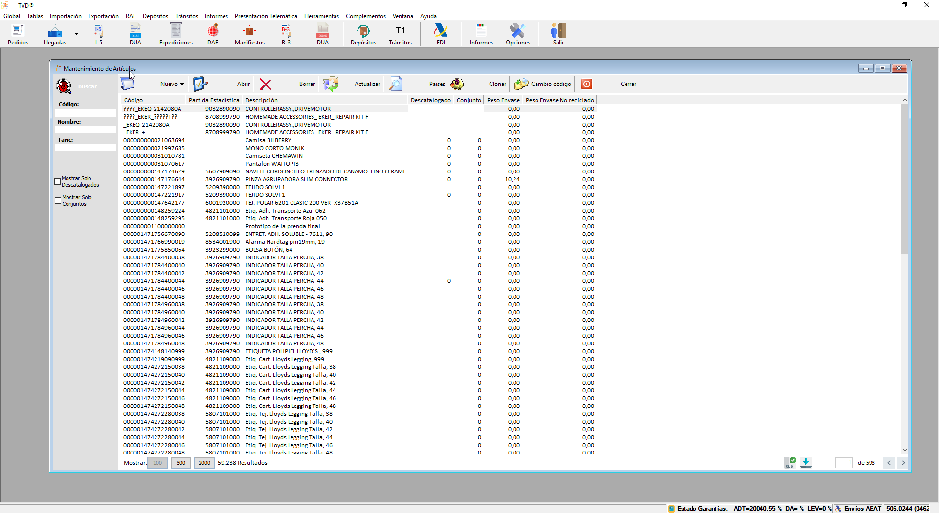Esta pantalla centraliza la gestión del catálogo de artículos (productos y referencias) en TVD. Desde aquí puede dar de alta, modificar, clonar o eliminar artículos, así como mantener datos arancelarios y de embalaje que luego se usan en todos los procesos de importación, depósito, tránsito y exportación.