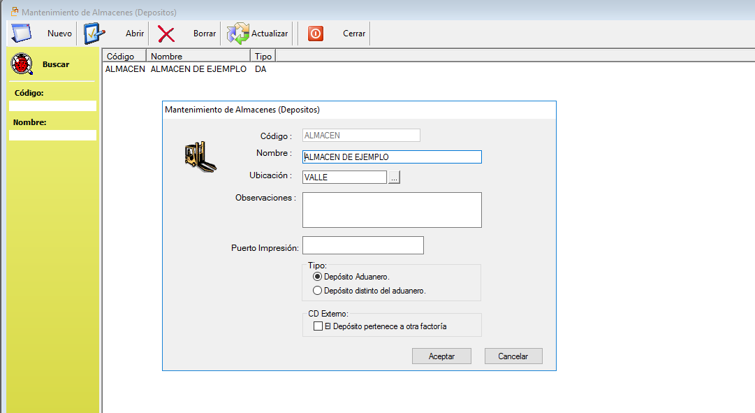 | Nombre | Nombre descriptivo del depósito (p.ej. “ALMACEN DE EJEMPLO”). |
