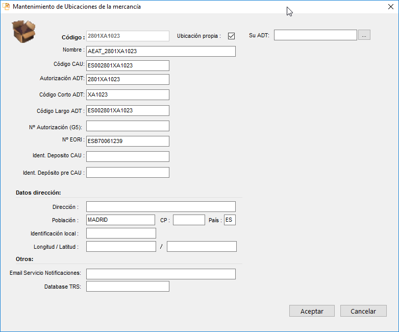 Registro detallado de cada sub-ubicación según requisitos AEAT (CAU, ADT, EORI).