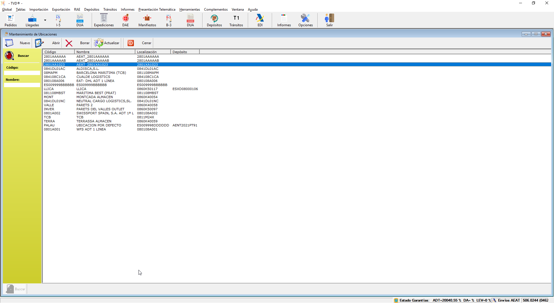 Esta ventana permite gestionar los almacenes aduaneros (depósitos) en TVD, tanto para depósitos aduaneros propios como salidas a depósito distinto del aduanero.