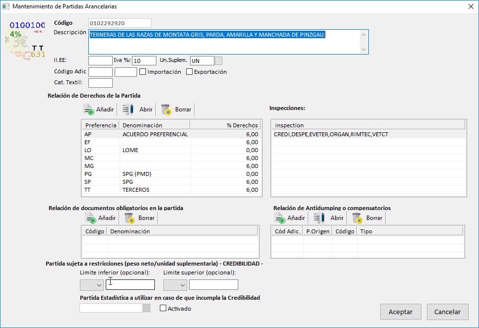 | Partida Estadística | Numérico | Código TARIC/HS de 8 dígitos asociado para calificación arancelaria. |