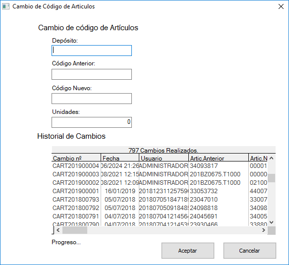 | 🔢 Cambio código | Renumera artículo | Permite modificar el Código de un artículo existente (tras desbloquearlo). |